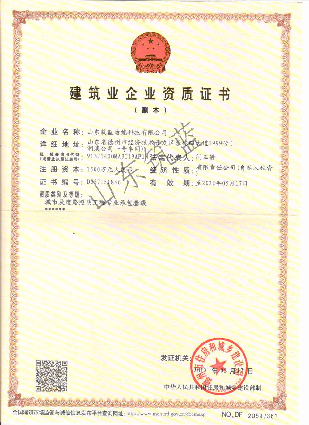 山東筑藍(lán)潔能科技有限公司創(chuàng)建于2015年,擁有建筑業(yè)企業(yè)資質(zhì)證書--城市及道路照明工程專業(yè)承包叁級,是一家集設(shè)計(jì)、生產(chǎn)制造、安裝服務(wù)于一體的新能源企業(yè),專業(yè)從事太陽能路燈、LED路燈、高桿燈、庭院燈、景觀燈、中華燈、草坪燈、光伏設(shè)備、風(fēng)能發(fā)電設(shè)備的生產(chǎn)及銷售、安裝及售后服務(wù);同時還從事凈水設(shè)備、空氣凈化器、光伏采暖設(shè)備、燃?xì)鉄崴、機(jī)電設(shè)備、玻璃鋼制品的銷售、安裝,LED照明及亮化產(chǎn)品、太陽能熱水器、光伏設(shè)備及元器件生產(chǎn)、銷售、安裝;建筑裝飾裝修工程施工、兼建筑幕墻工程施工、建筑智能化工程施工等產(chǎn)品專業(yè)生產(chǎn)加工的公司,擁有完整、科學(xué)的質(zhì)量管理體系。