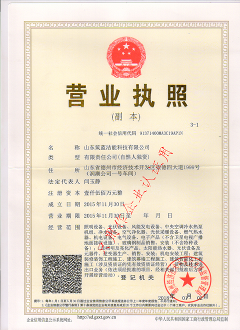 山東筑藍潔能科技有限公司創(chuàng)建于2015年,擁有建筑業(yè)企業(yè)資質證書--城市及道路照明工程專業(yè)承包叁級,是一家集設計、生產制造、安裝服務于一體的新能源企業(yè),專業(yè)從事太陽能路燈、LED路燈、高桿燈、庭院燈、景觀燈、中華燈、草坪燈、光伏設備、風能發(fā)電設備的生產及銷售、安裝及售后服務;同時還從事凈水設備、空氣凈化器、光伏采暖設備、燃氣熱水器、機電設備、玻璃鋼制品的銷售、安裝,LED照明及亮化產品、太陽能熱水器、光伏設備及元器件生產、銷售、安裝;建筑裝飾裝修工程施工、兼建筑幕墻工程施工、建筑智能化工程施工等產品專業(yè)生產加工的公司,擁有完整、科學的質量管理體系。